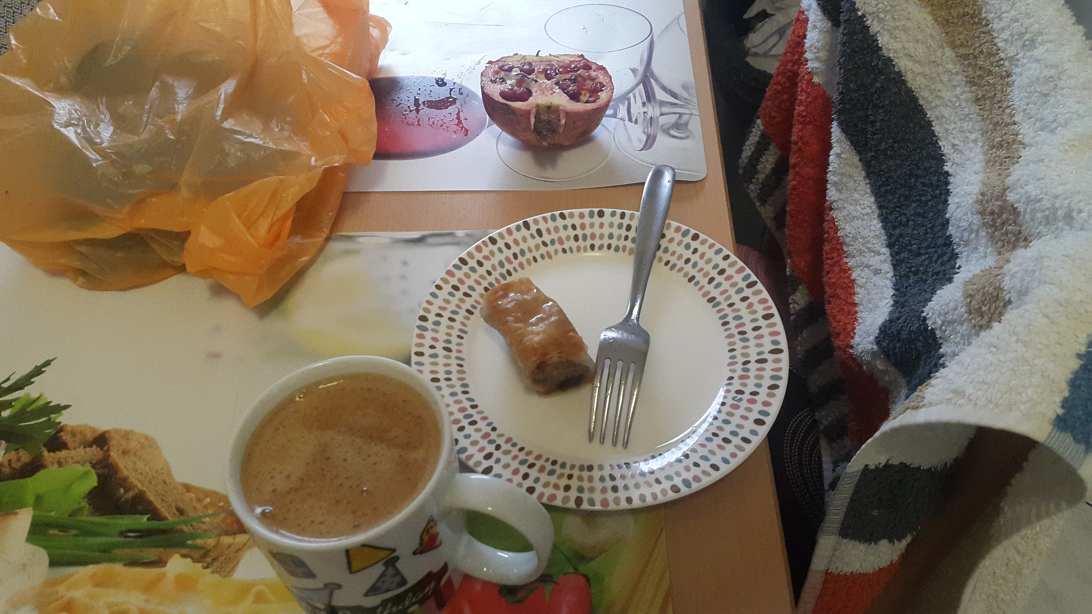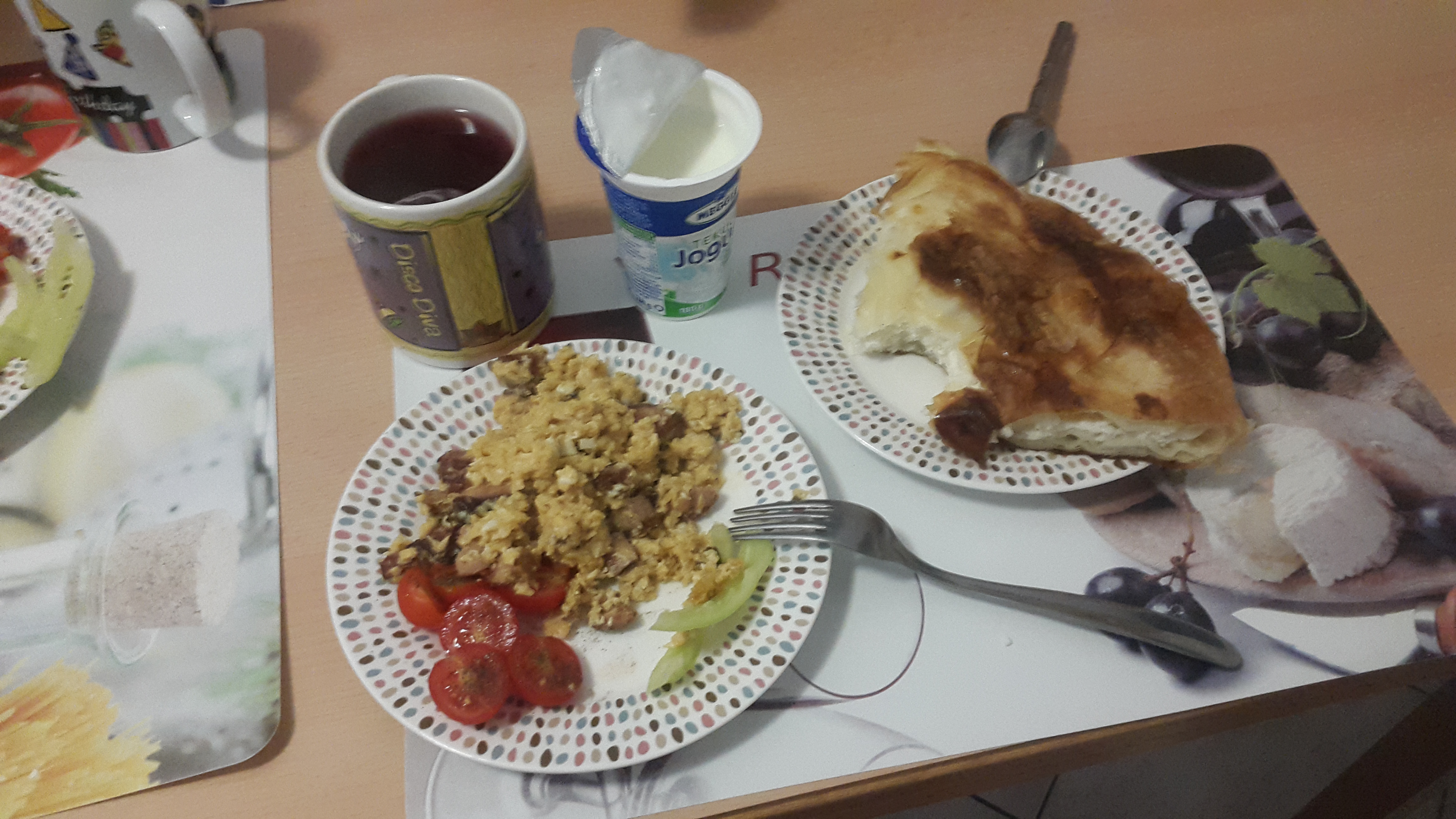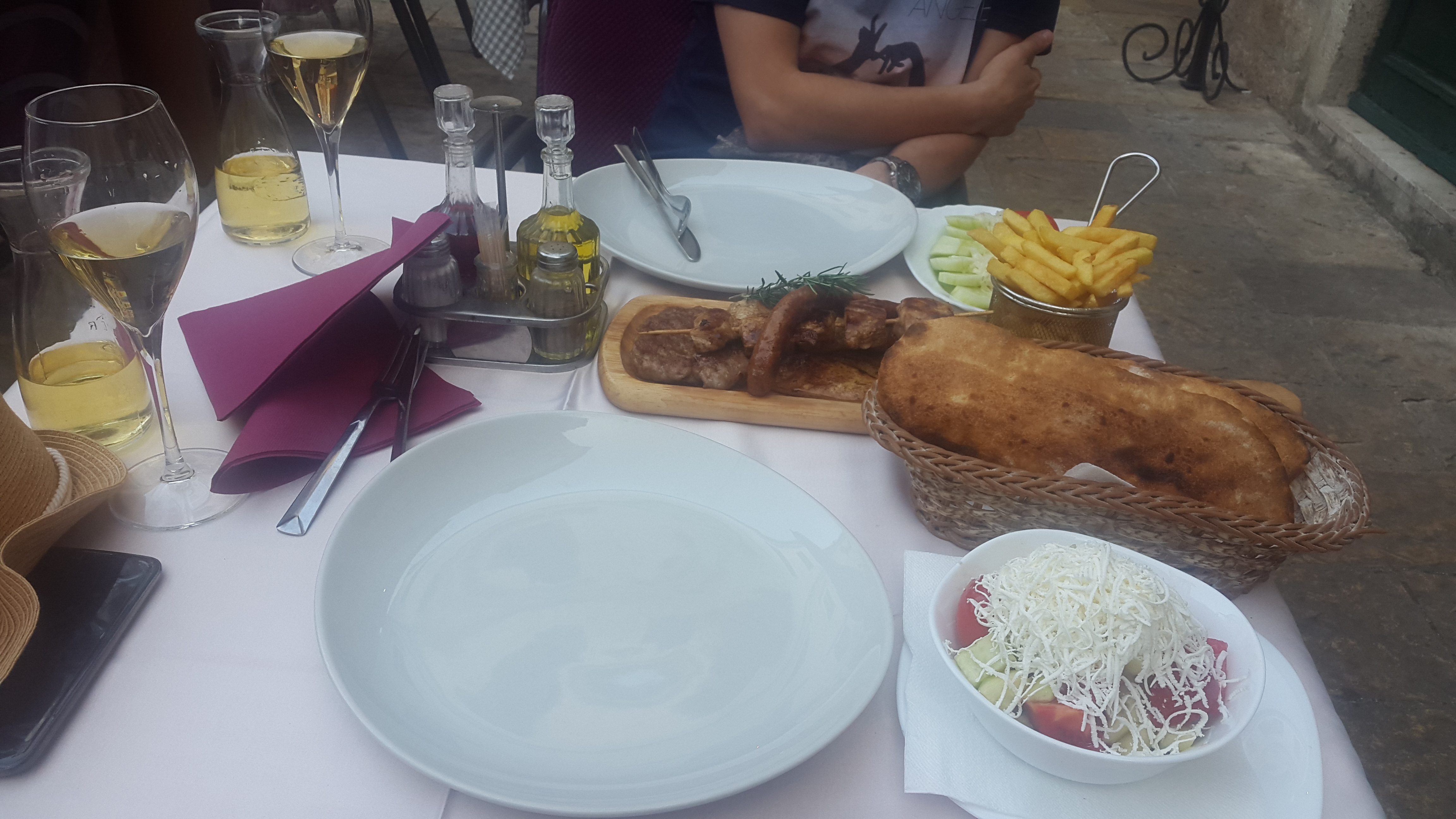kawa, lokalne owoce (w zależności od sezonu; w październiku były najlepsze granaty i winogrona), lokalne wina, sery, suszone szynki, burek, rakija, baklava