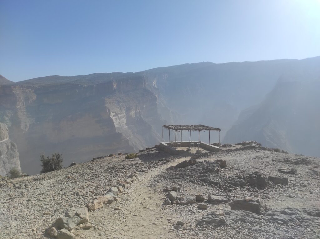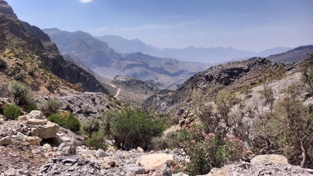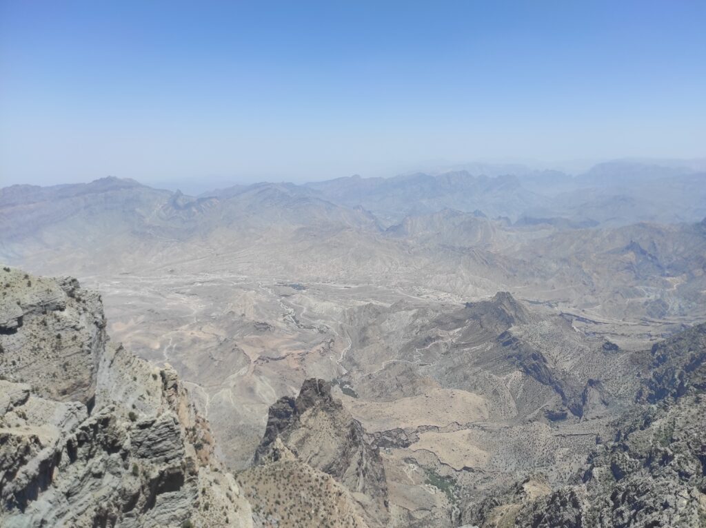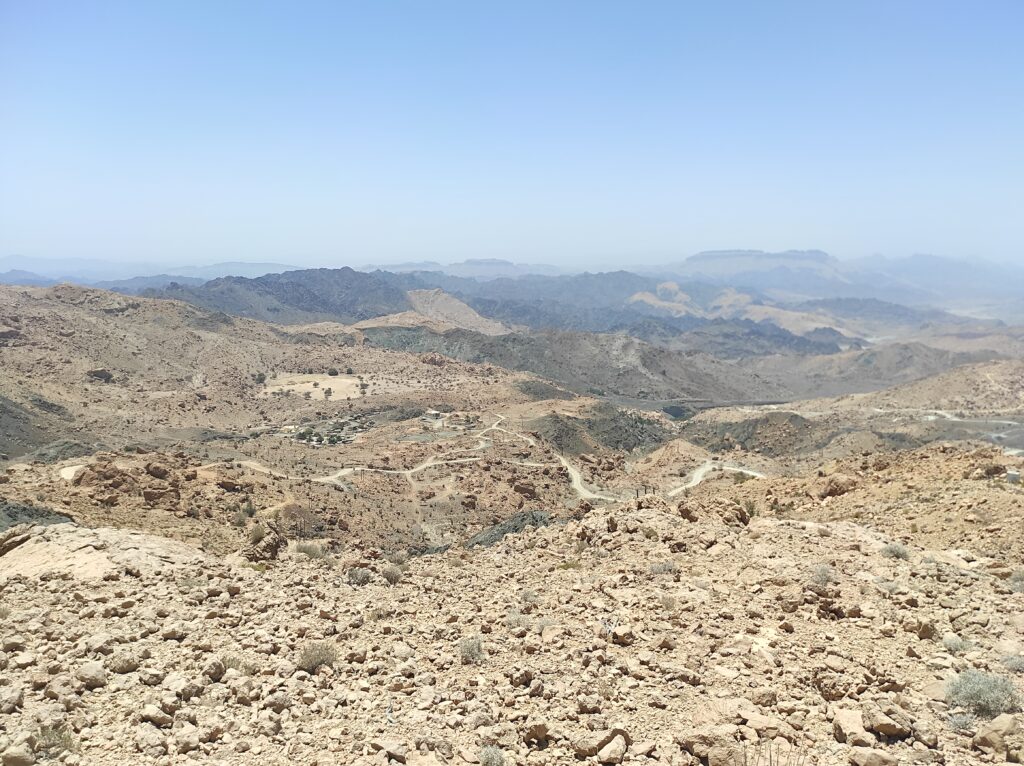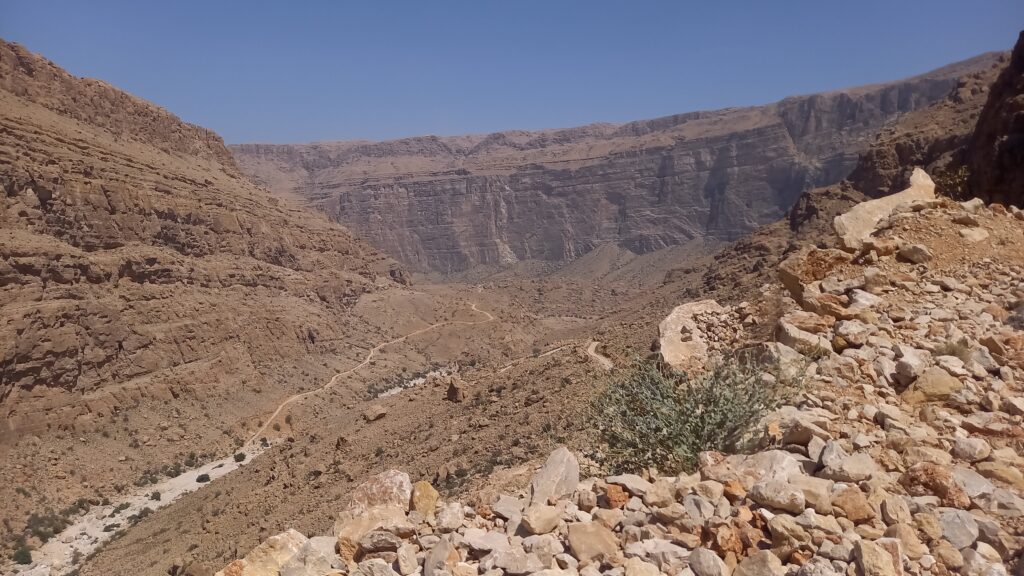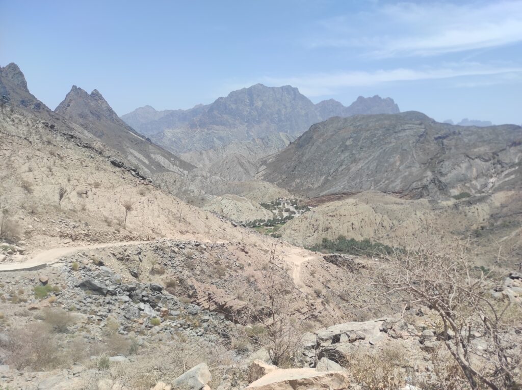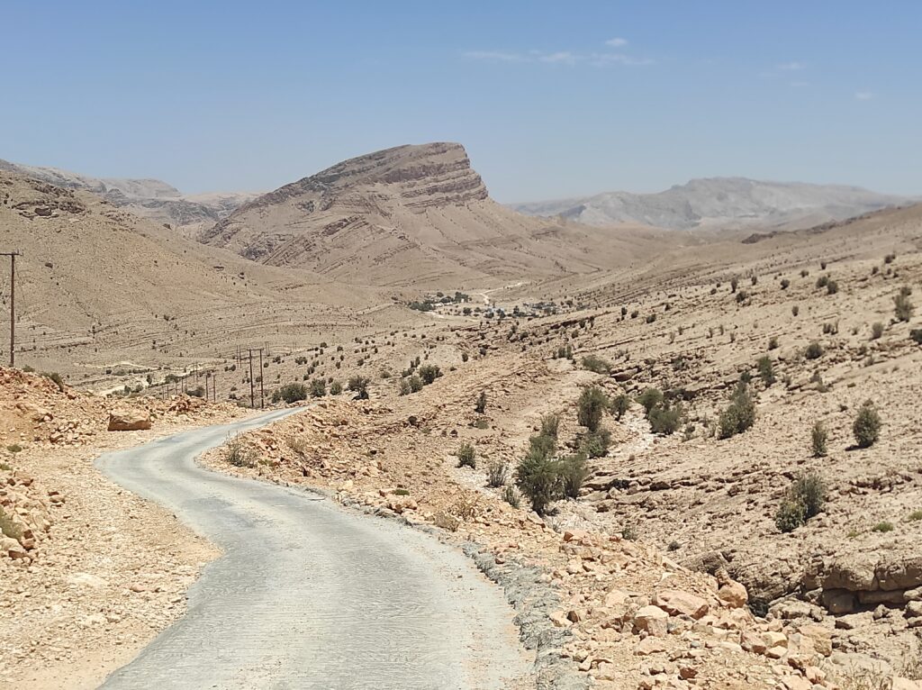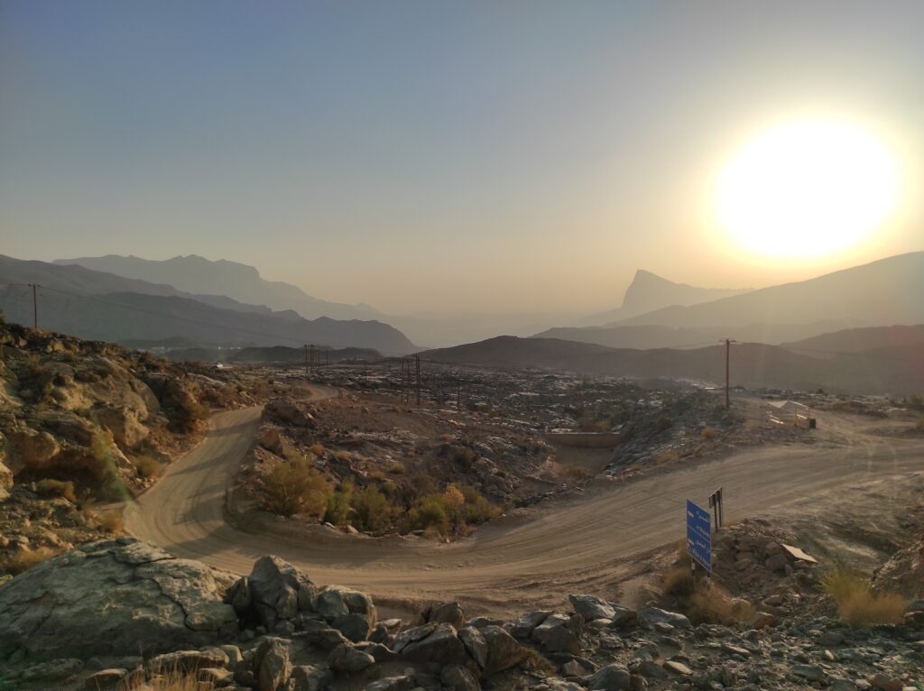 Po długim odpoczynku w Al-Hamra, które traktowaliśmy jako czas na aklimatyzację, ruszamy w kierunku gór. Przez pierwsze 30 km jedziemy po asfaltowej, równej drodze, która stopniowo pnie się w górę. Z każdą chwilą krajobraz staje się coraz bardziej imponujący, a temperatura spada o kilka stopni – z 42°C do 36°C, co jest prawdziwą ulgą. Po pewnym czasie nawierzchnia zmienia się na szutrową, nierówną, ale to tylko dodaje uroku tej podróży. Co jakiś czas pojawiają się fragmenty asfaltu, jakby lokalne władze planowały doprowadzić asfalt aż do samego końca trasy. Kilka kilometrów przed końcem drogi znajduje się Cliff Cafe, gdzie można zrobić krótki przystanek, wypić kawę i podziwiać zapierające dech w piersiach widoki na skalne zbocza. To także świetne miejsce, by kupić lokalne rękodzielnicze pamiątki.
