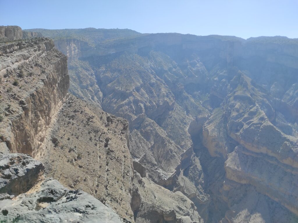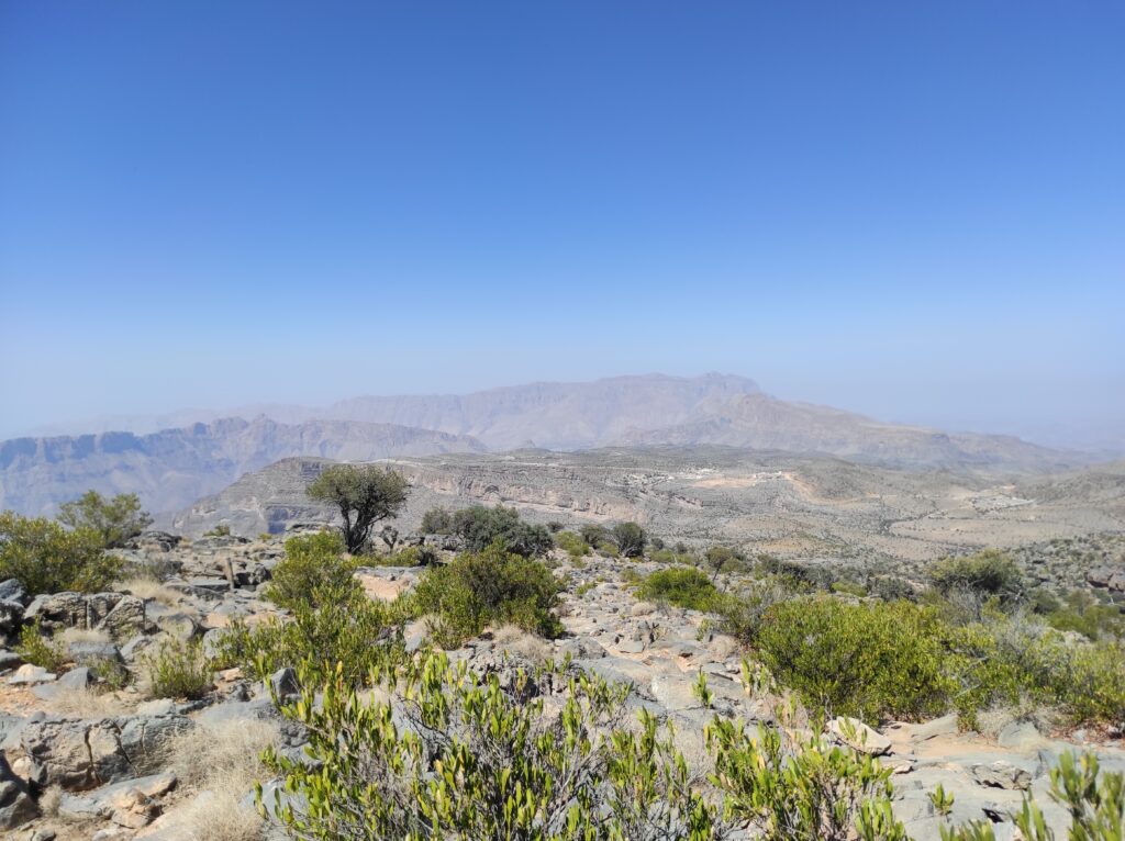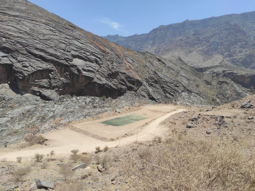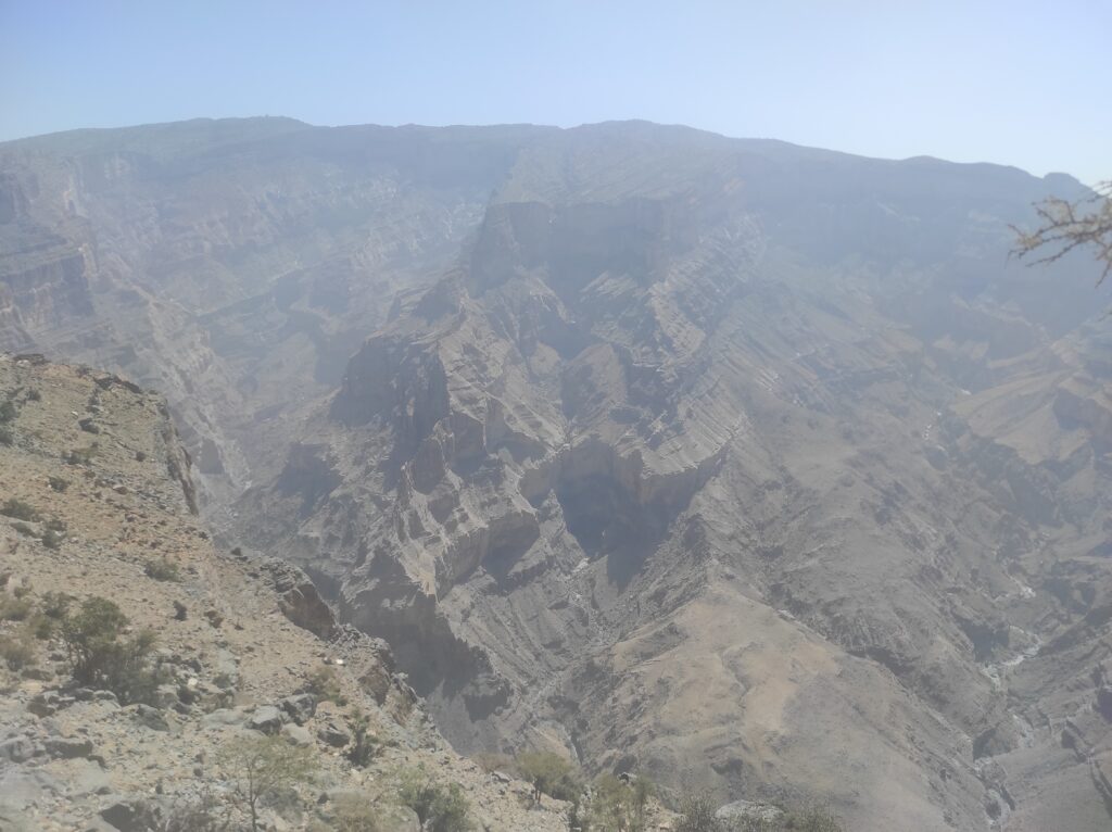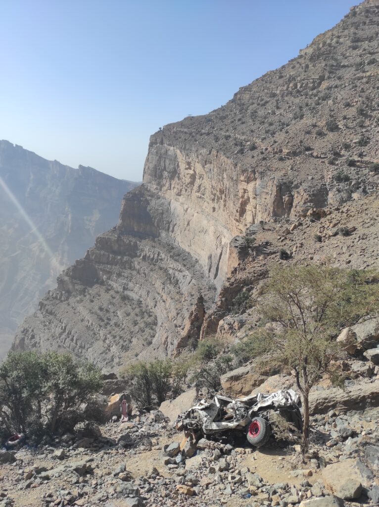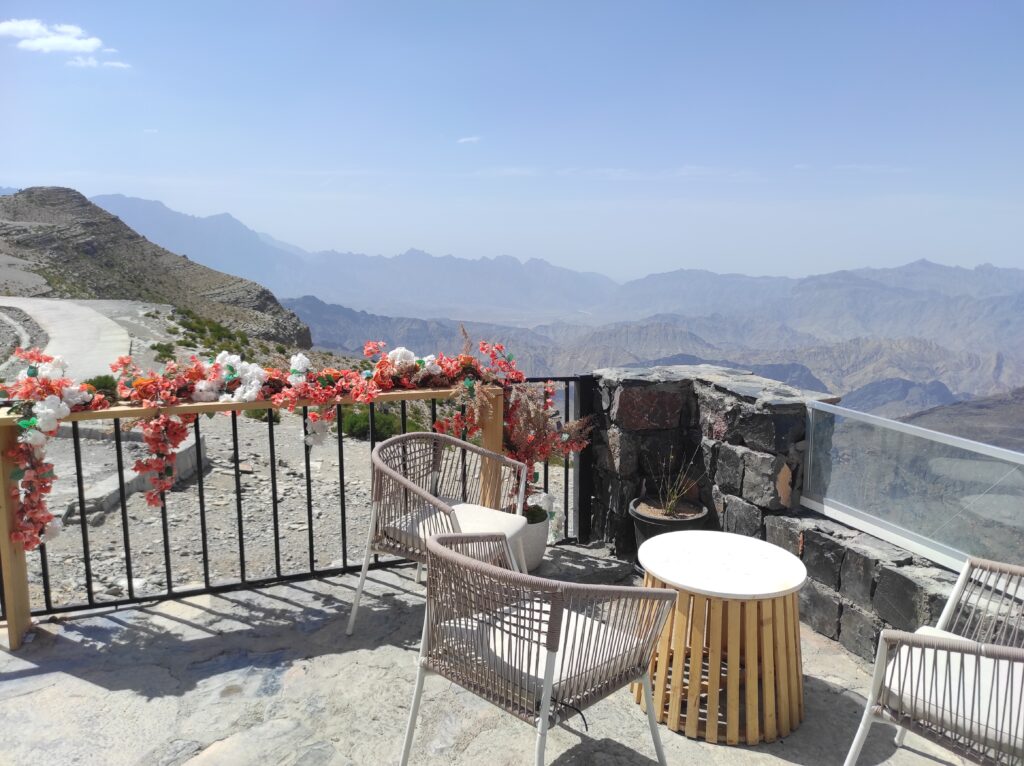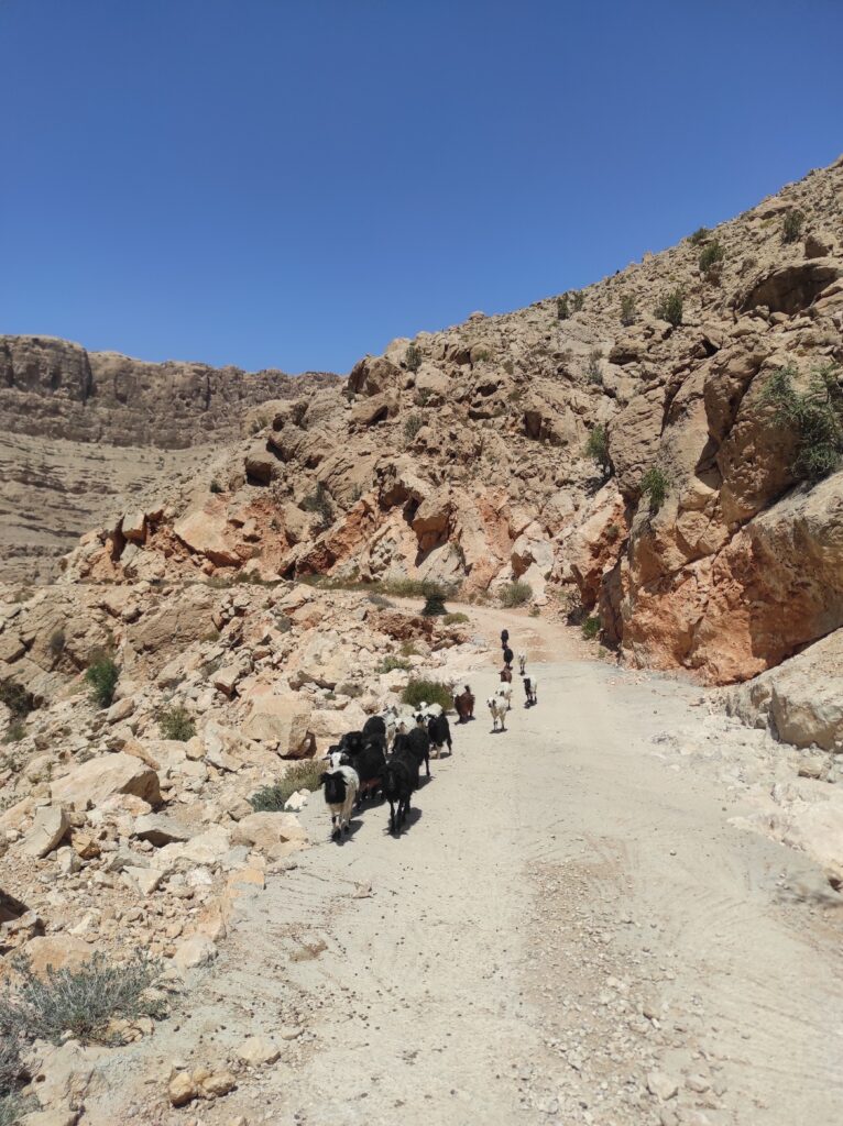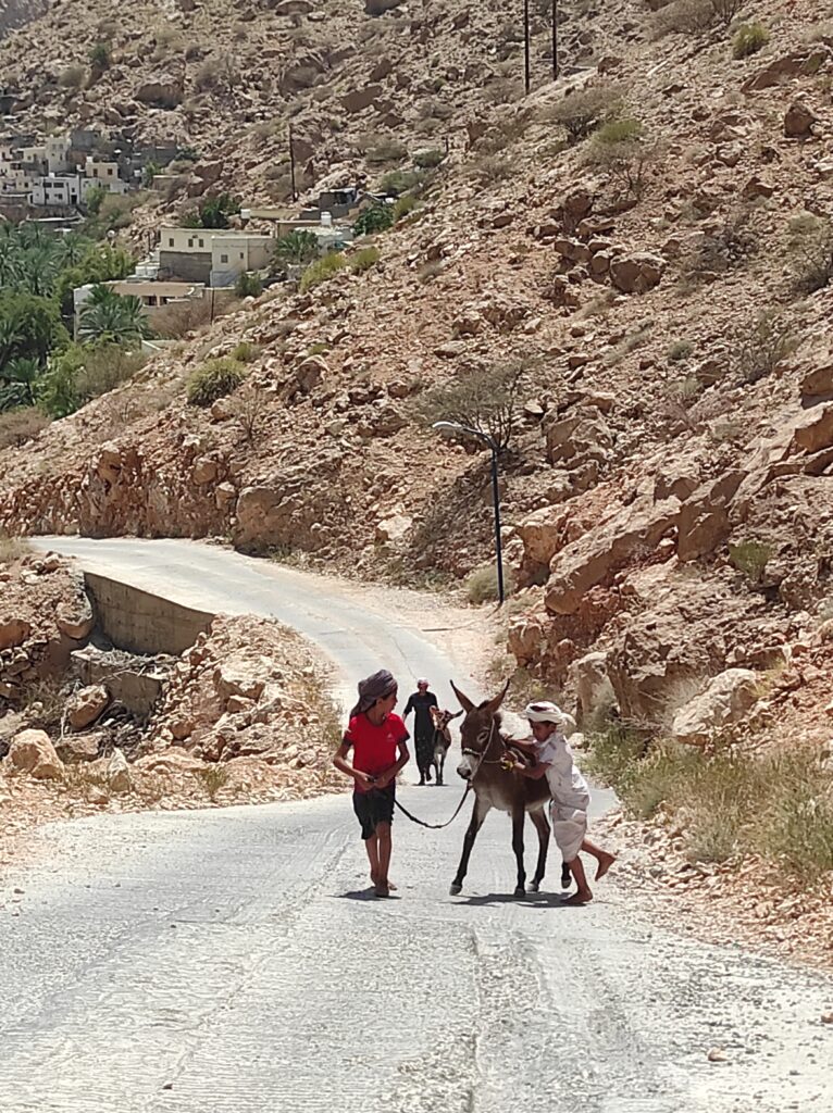 Po długim odpoczynku w Al-Hamra, które traktowaliśmy jako czas na aklimatyzację, ruszamy w kierunku gór. Przez pierwsze 30 km jedziemy po asfaltowej, równej drodze, która stopniowo pnie się w górę. Z każdą chwilą krajobraz staje się coraz bardziej imponujący, a temperatura spada o kilka stopni – z 42°C do 36°C, co jest prawdziwą ulgą. Po pewnym czasie nawierzchnia zmienia się na szutrową, nierówną, ale to tylko dodaje uroku tej podróży. Co jakiś czas pojawiają się fragmenty asfaltu, jakby lokalne władze planowały doprowadzić asfalt aż do samego końca trasy. Kilka kilometrów przed końcem drogi znajduje się Cliff Cafe, gdzie można zrobić krótki przystanek, wypić kawę i podziwiać zapierające dech w piersiach widoki na skalne zbocza. To także świetne miejsce, by kupić lokalne rękodzielnicze pamiątki.