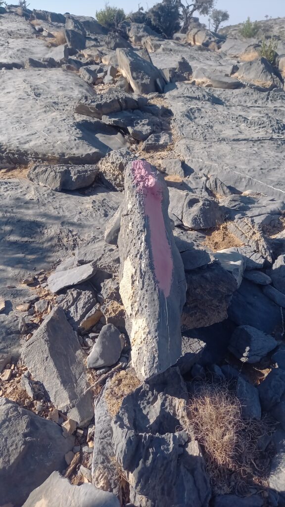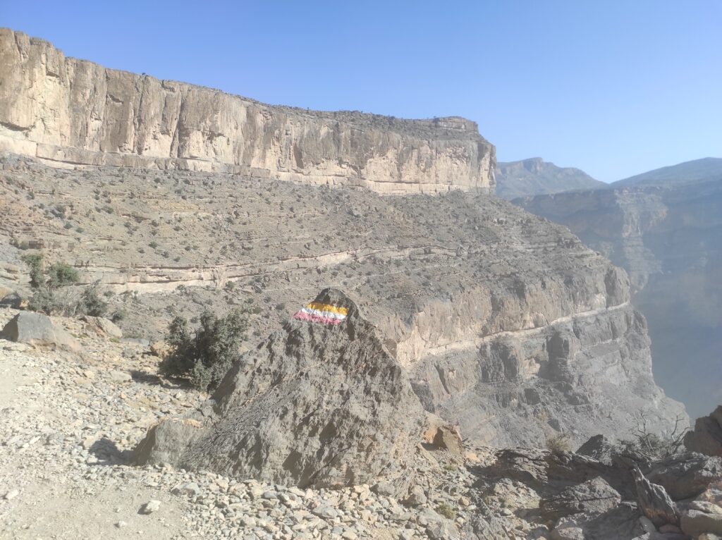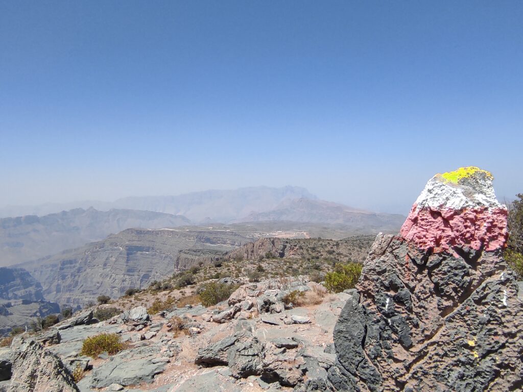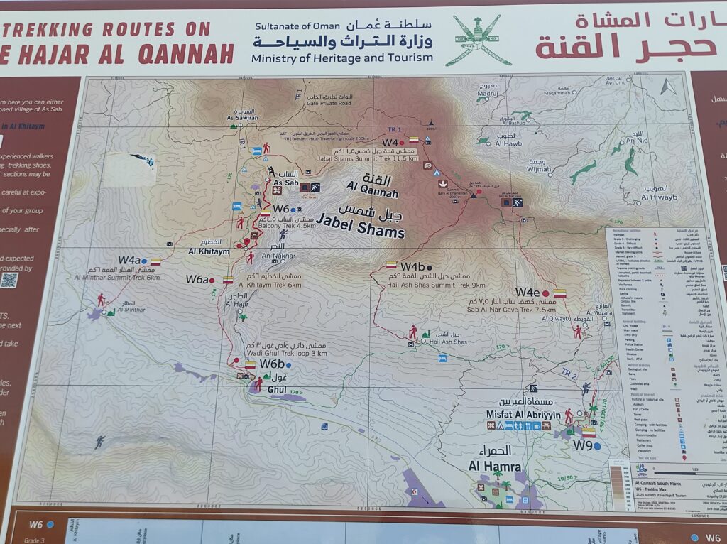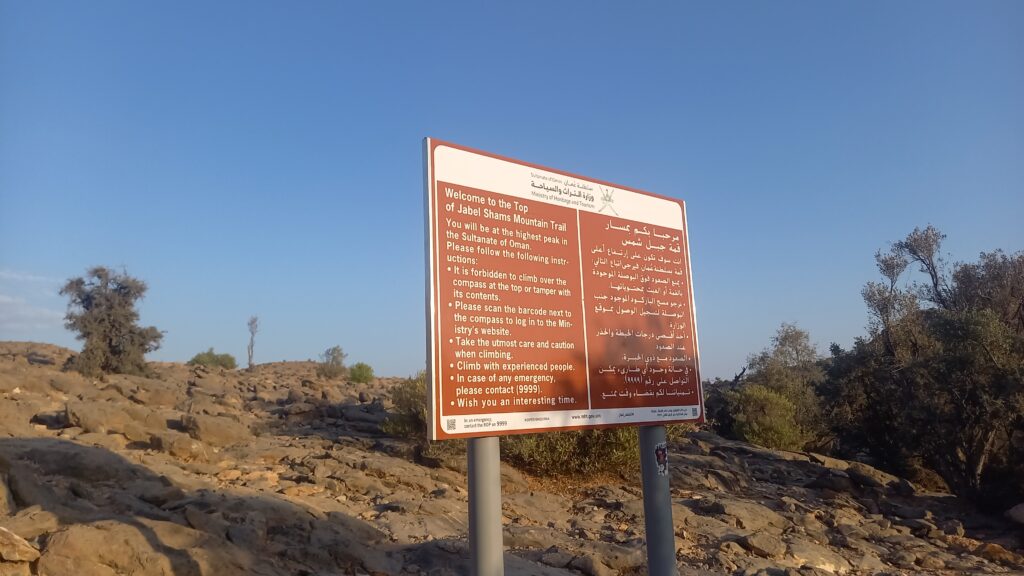 Po zaaklimatyzowaniu się i wstępnym oswojeniu się z upałem ruszamy na najwyższy szczyt Omanu – Jebel Shams. Szlak oznaczony jest jako W4, choć tę nazwę widzieliśmy tylko na tablicy przed rozpoczęciem szlaku. Sam szlak zaczyna się przy hotelu Sama Heights Resort. Link do mapy – KLIK. Jego całkowita długość to około 11,5 km w jedną stronę. Cała wędrówka, z licznymi przerwami na zdjęcia i uzupełnianie zapasów wody, zajęła nam około 10 godzin.