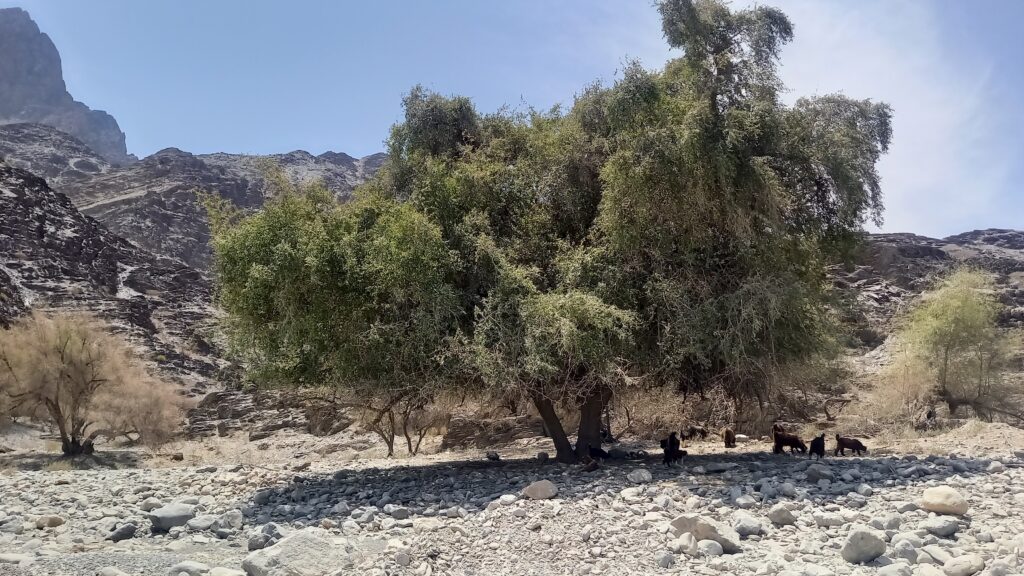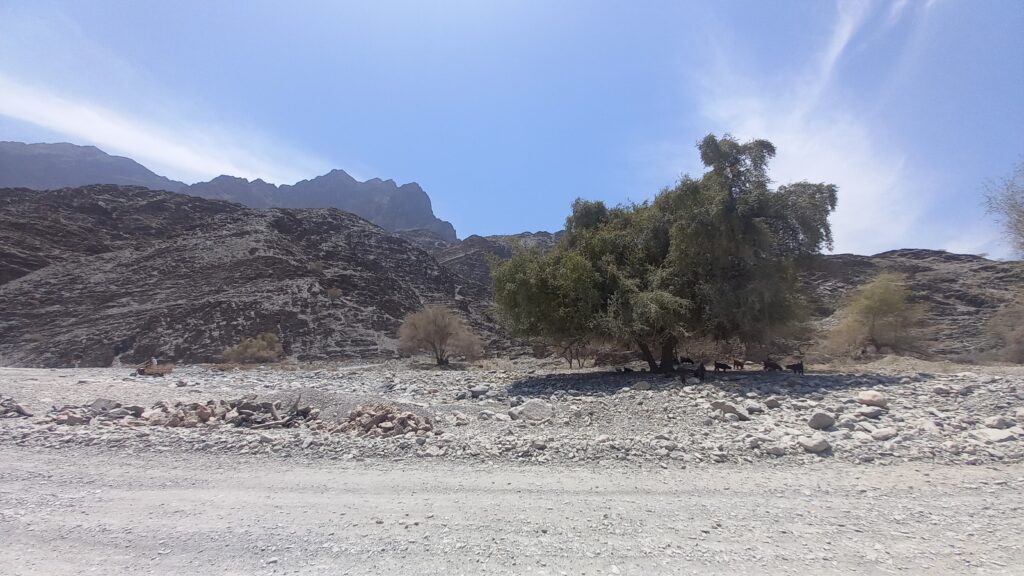Po wyjeździe z Bidiyah kierujemy się na północ na wybrzeże. Gorsze samochody mogą wybrać dłuższą i lepszą jakościowo drogę na wschód przez Sur (zachaczając o Wadi Bani Khalid). Mając jednak samochód z lepszym zawieszeniem i trybem 4×4 polecamy szutrową trasę na północ przez miejscowości Adh-Dhahir i Sumayyan. Trasa momentami bardzo wymagająca i bardzo męcząca dla kierowcy, wynagradza przepięknymi widokami przypominającymi momentami planetę Mars. Po drodze mijamy kilka mniejszych górskich miejscowości w których możemy zobaczyć jak żyje się biedniejszej części kraju. Po drodze mijamy koryto rzeki Tiwi, gdzie w porze deszczowej płynie szeroki strumień – w porze suchej kompletnie wyschnięty.