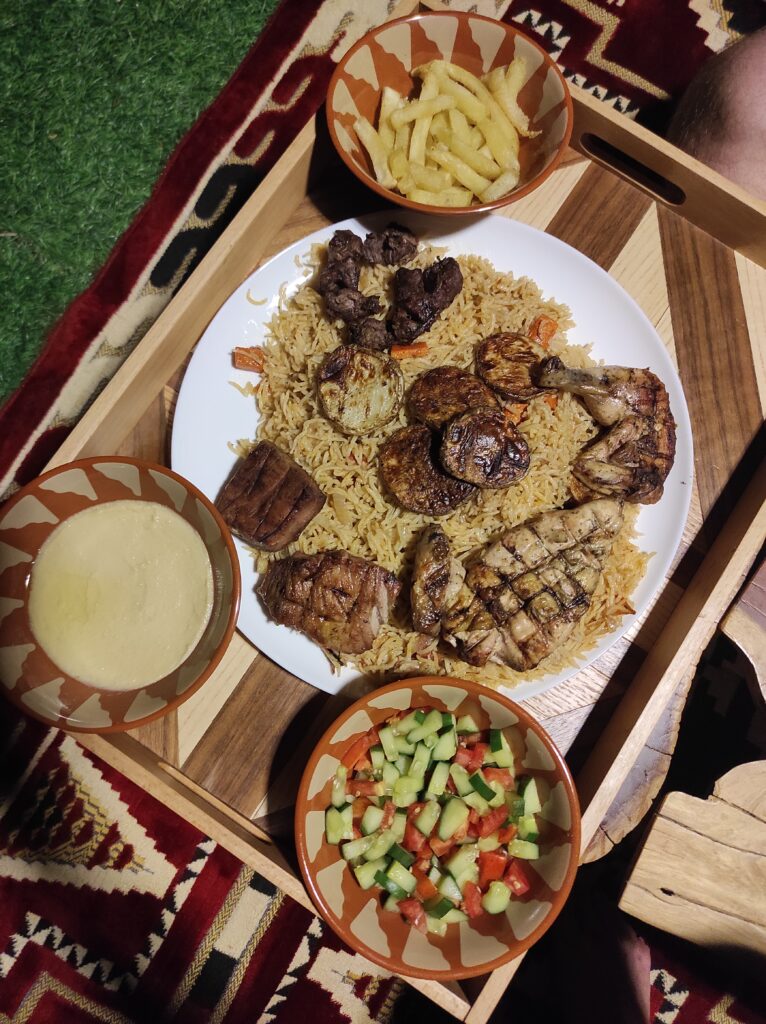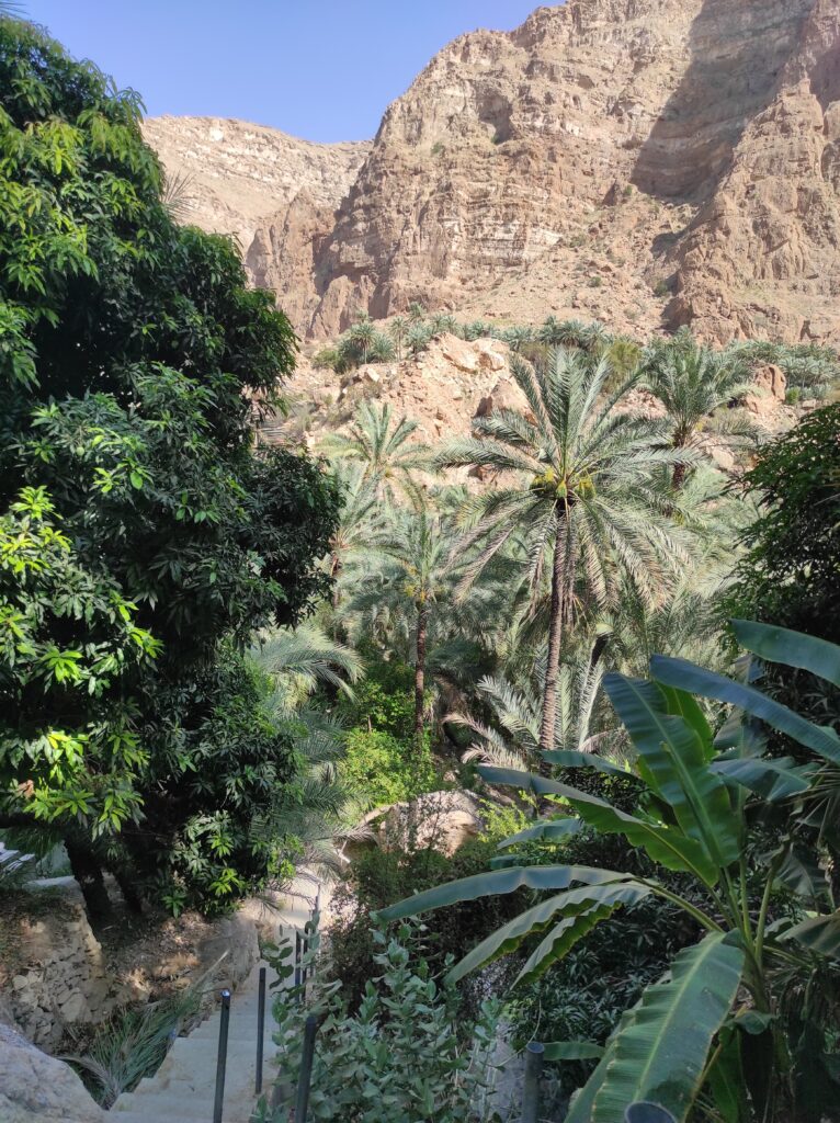Po zwiedzeniu Al-Hamra, tuż przed zmrokiem, warto udać się do Misfat Al Abryiin – malowniczej wioski, która leży w górach Omanu. To miejsce słynie z tarasowych ogrodów, tradycyjnych kamiennych domów i systemu irygacyjnego faladż, który od wieków zapewnia wodę w tym suchym regionie. Misfat Al Abryiin, pełne wąskich uliczek i autentycznej atmosfery, zachwyca widokami na dolinę oraz oazę palmową, które w pełni oddają piękno omanej wsi. Po zmroku wzdłuż dróg pojawiają się małe punkty gastronomiczne, w których lokalni mieszkańcy grillują na prowizorycznych rożnach i grillach. Jest to prawdziwa okazja, by spróbować pysznych, tanich szaszłyków drobiowych, które można kupić za około 10 zł, a do tego skosztować orzeźwiających napojów. Takie małe, lokalne przyjemności stanowią doskonałe zakończenie dnia w tej magicznej okolicy.