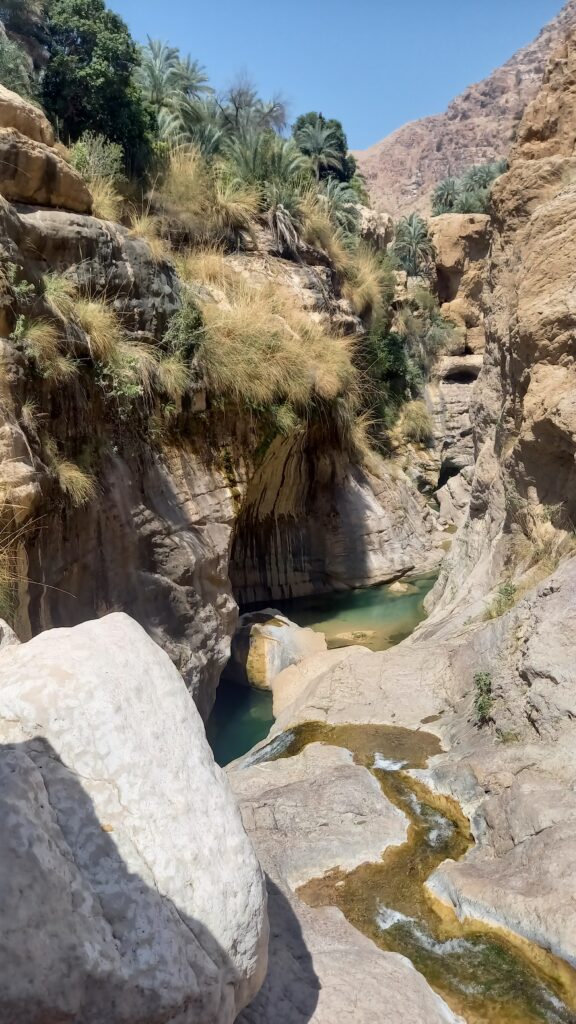 Do basenu z parkingu idziemy ok. 15 minut wzdłuż faladży ukrytych pod palmami. Sam kompleks basenów wygląda imponująca i jest zasilany wodą spływającą z kilkunastometrowego wodospadu.